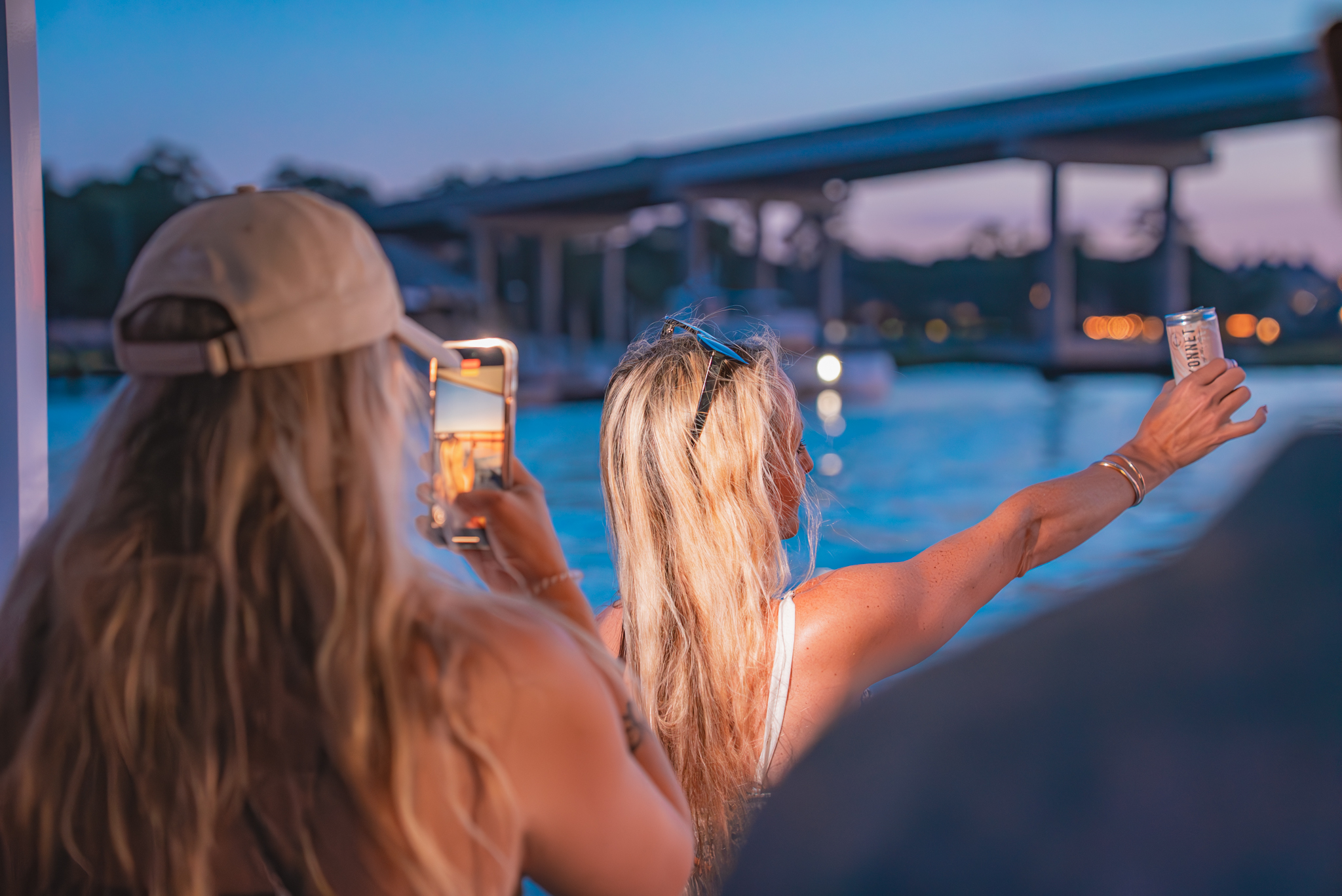 People on a sailboat, with two taking a selfie and one drinking from a can, in front of the ocean.
