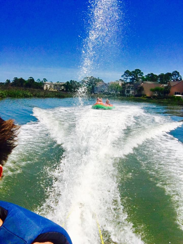 Hop aboard and hang on! Enjoy the big inflatable Banana Boat for a ride of a lifetime. The Captain can adjust for the age and bravery of all riders. We can take up to six passengers per trip on our Banana Boat rides. You get pulled behind a high powered Yamaha jet ski as you get splashed, bounced, and slung through the beautiful waterways of Hilton Head Island. The banana boat is fun for all ages, and a great way for families to get on the water together!